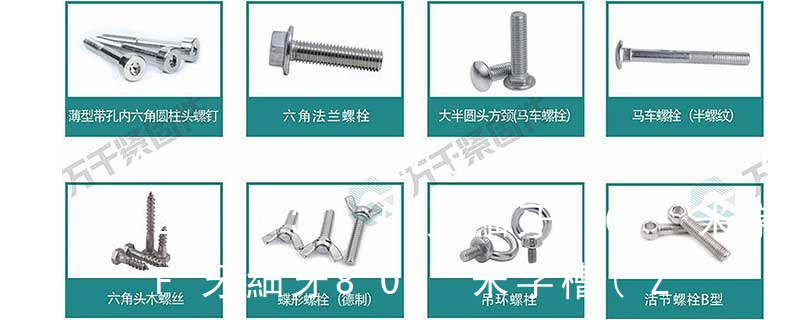 1.機螺釘 2.自攻螺釘 3.鉆尾螺釘 4.墻板釘 5.纖維板釘 6.木螺釘7.六角木螺釘 8.不脫出螺釘 9.組合螺釘 10.微型螺釘 11.家具螺釘 12.電子螺釘頭型:1.六角頭(hexagon head) 2.六角頭法蘭面(hexagon head with flange) 3. (鐵板牙自攻螺絲) B-2: Plastic Tapping Screw. (塑膠用,自攻螺絲) C: Wooden Screw : 木工螺絲 D: Drywall Screw :水泥墻螺絲 E: Self Drilling Screws鉆尾螺絲(不銹鋼鉆尾螺絲,復(fù)合材料鉆尾螺絲) F:膨脹螺絲,四片膨脹螺絲又